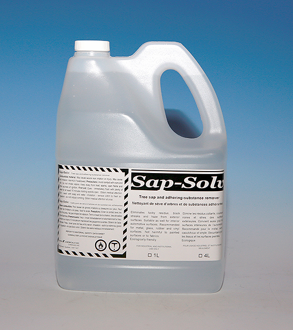 Tree sap and adhering-substance remover. Eliminates tacky residue, black streaks and haze from exterior surfaces. Suitable as well for interior automotive surfaces. Recommended for metal, glass, rubber and vinyl surfaces. Not harmful to painted surfaces or to fabrics. Ecological.